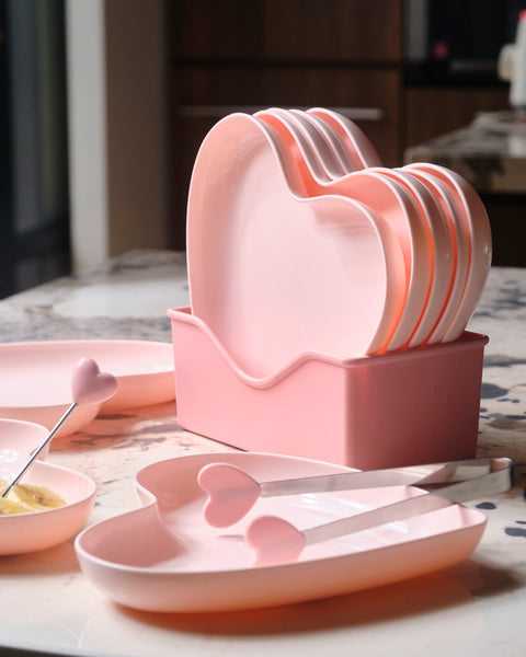 Pink heart-shaped plates. Comes in a set of 8. Perfect for a pool party or picnic with the girls!